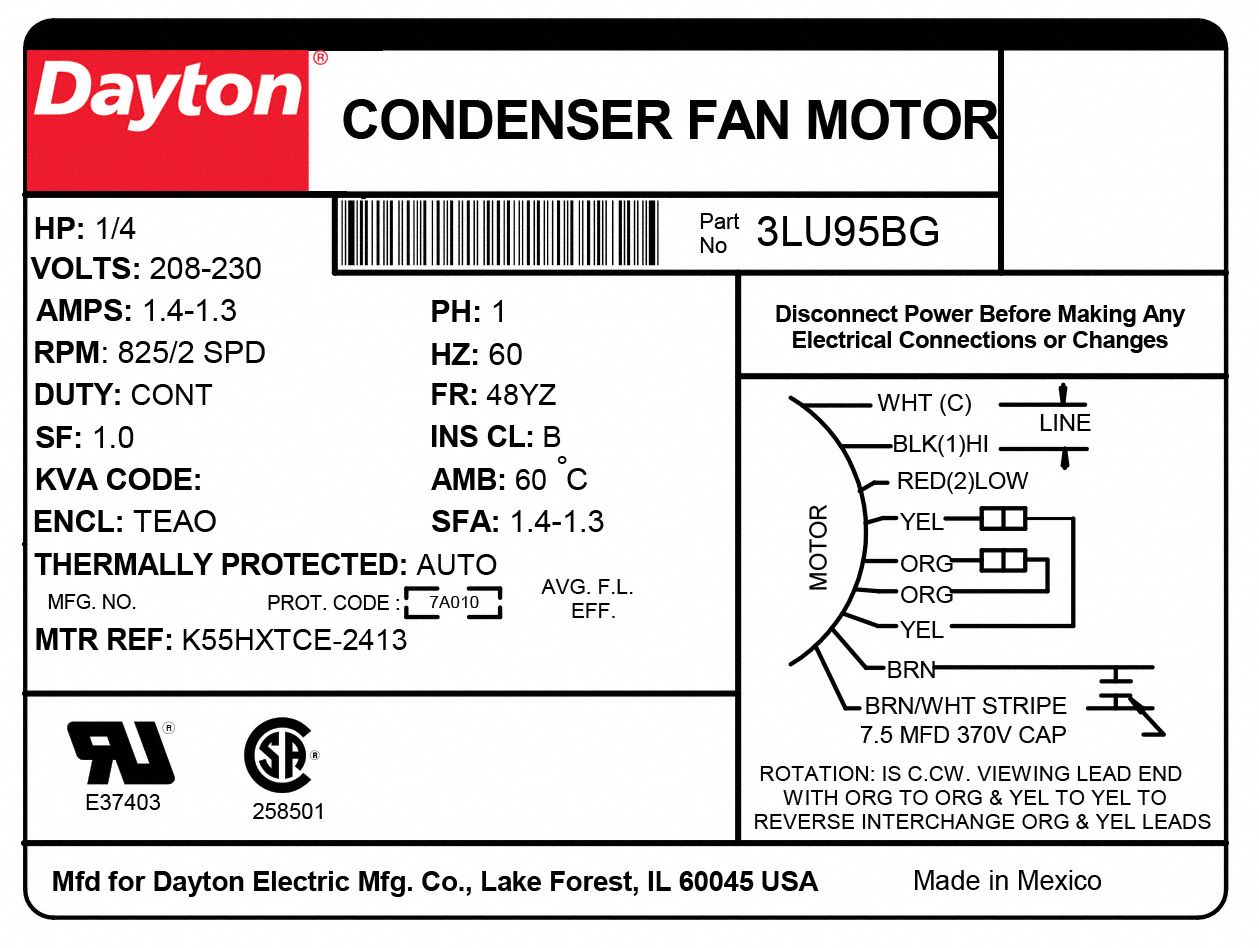 Dayton Condenser Fan Motor Stud Mount Totally Enclosed Air Over 1 4 Hp 825 Nameplate Rpm Auto 3lu95 3lu95 Grainger